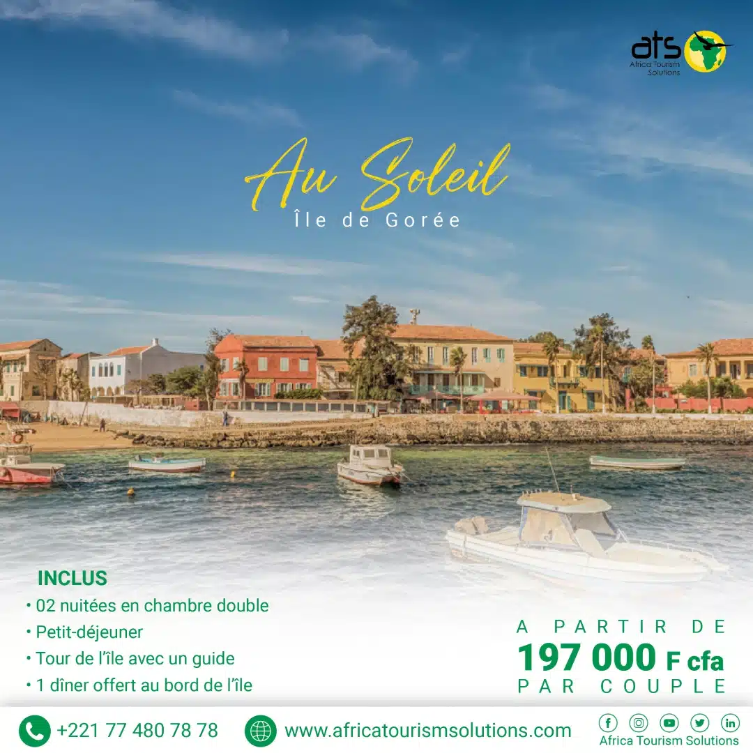 Gorée, terre d’histoire !  Classé au patrimoine mondial, Gorée inspire et transmet des émotions fortes. C’est une île où le passé s’exprime encore, où chaque ruelle vous inspire grâce à une architecture colorée, d’un autre siècle.  Optez pour ce séjour romantique et paisible à 30 minutes de Dakar. Échappez-vous à Gorée, profitez de l’ambiance, des mets savamment préparées et d’un confort optimal !  Un séjour de 02 nuitées qui se présente comme un moment incontournable, qu’il vous faut vivre !  Ne ratez pas cette immersion au cœur de l’histoire à 197,000 francs pour 02 personnes.